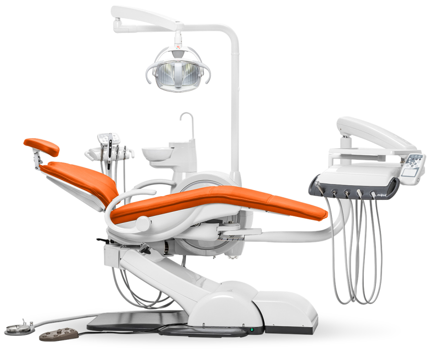 Главная особенность модели — система «Перформер», позволяющая переключать конфигурацию для врачей правши и левши без потери функциональности. Это решение делает установку по-настоящему универсальной. Чугунное основание и каркас кресла из алюминиевого сплава обеспечивают исключительную устойчивость.